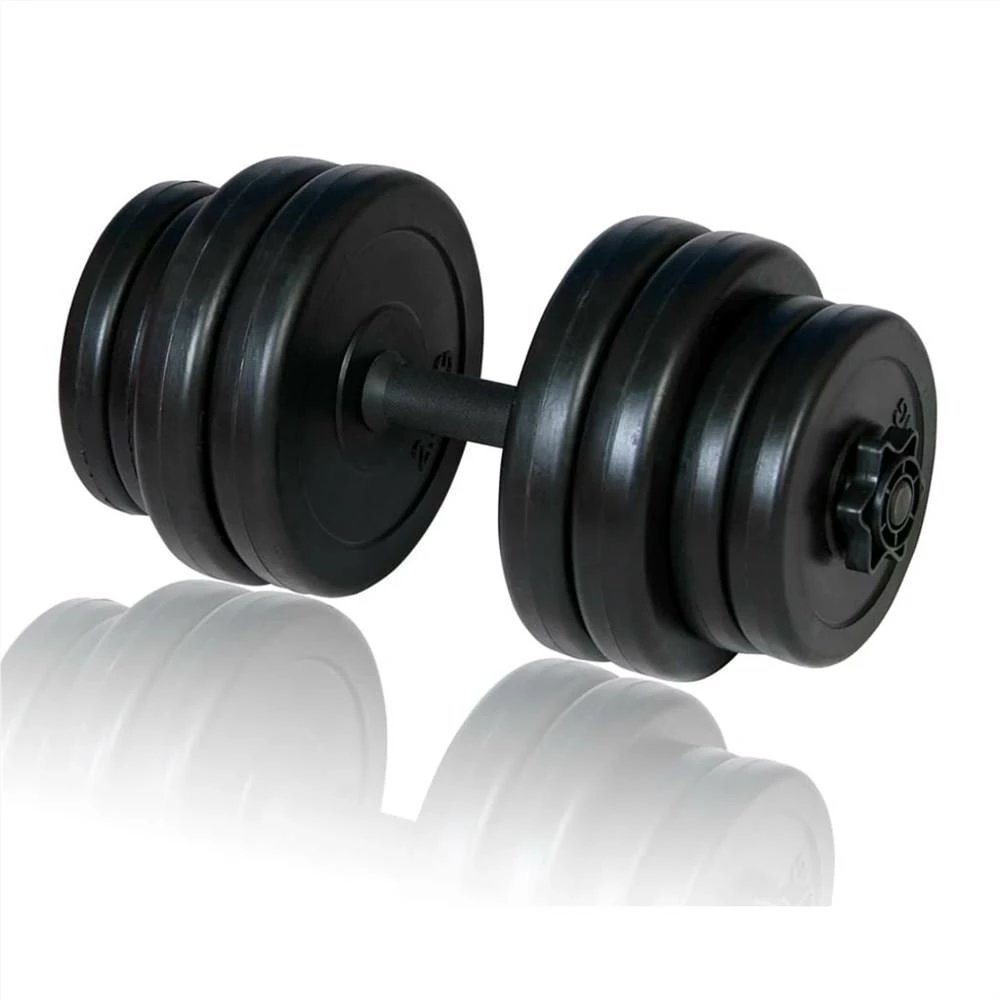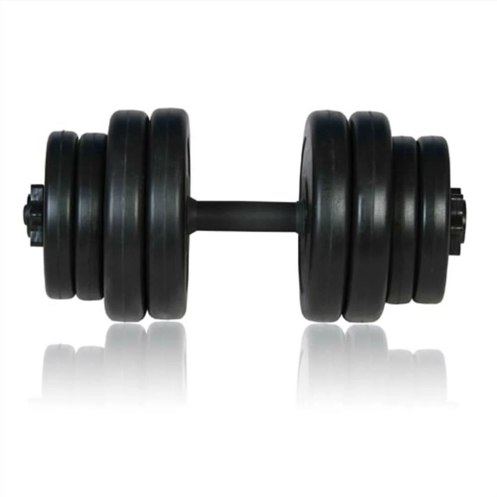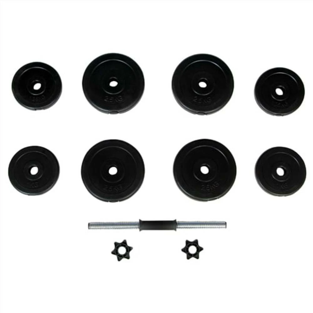 This ergonomic dumbbell set has a total weight of 15kg. The dumbbells have anti-slip plastic handles so you will be able to work-out without having to worry that the dumbbells will slip from your hands and fall. The screw-caps have star bolts to make sure that the weight plates are always mounted firmly and secure on the bar. The bar of the dumbbell is made of strong metal. The grip surface is approx. 14,5cm. The weight plates are covered with robust, floor-friendly plastic, this allows you not to experience any annoying clanging sounds of the weights.