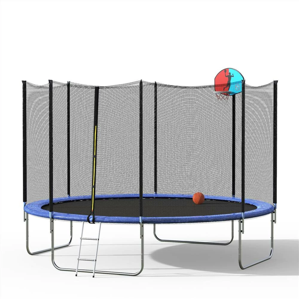 The excellent trampoline features 4 U-shaped rust resistance steel legs attached to the mat for better stability and balance. Included basketball hoop brings multiple functions for the trampoline, offering a double dose of fun. The jumping mat is linked to the frame securely with robust springs, bringing superior and safe bounce. The gap between the jumping mat and frame is covered with thickening PVC padding, no gap design eliminates hazards. For added convenience, a ladder is attached to the edge of the frame, so you can climb easily.