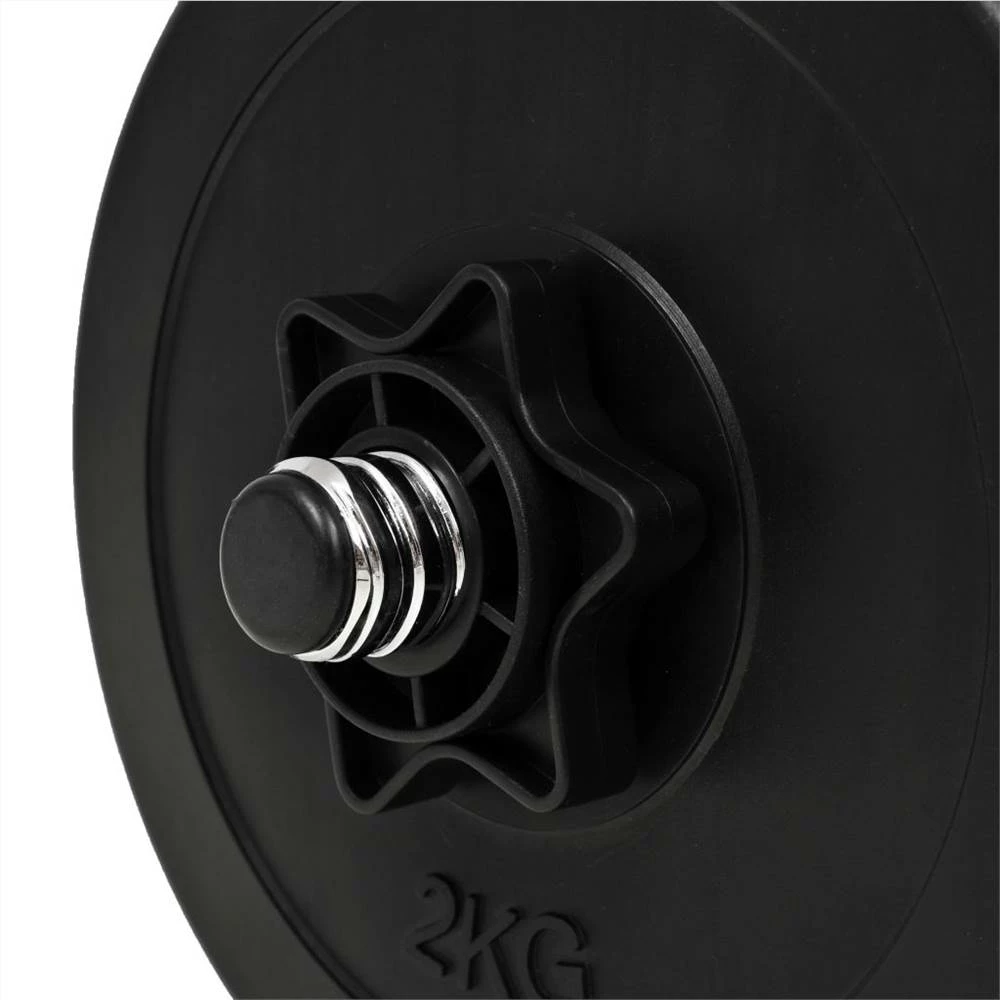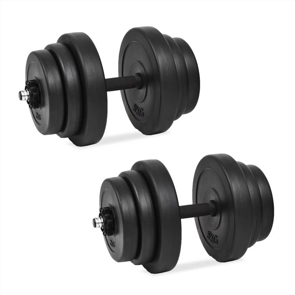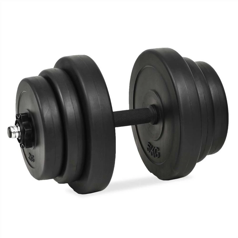 This versatile dumbbell set is perfect for targeting chest, biceps, arms, triceps and back muscles. It includes four 5 kg weight plates, four 2.5 kg weight plates, four 2 kg weight plates and two 1 kg dumbbell bars with spinlock collars and has a total weight of about 40 kg. This set allows the users to variably select the weights they want to lift for different exercises. These weight plates are made of cement covered in robust plastic and they can easily be secured onto the bars with the included spinlock collars. The weight is clearly stamped on each plate for quick and easy identification. The dumbbell bars have non-slip plastic grip.