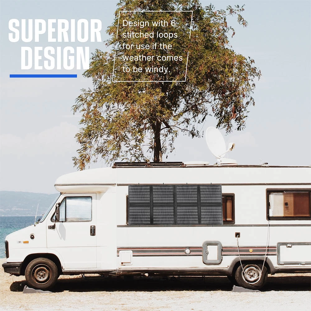 With a robust carrying handle, this foldable solar panel is only 7.9kg and can be packed down to 1/8 of its full size and comes with 8 stitched loops as an added bonus for use if you make up some hooks when it gets windy.