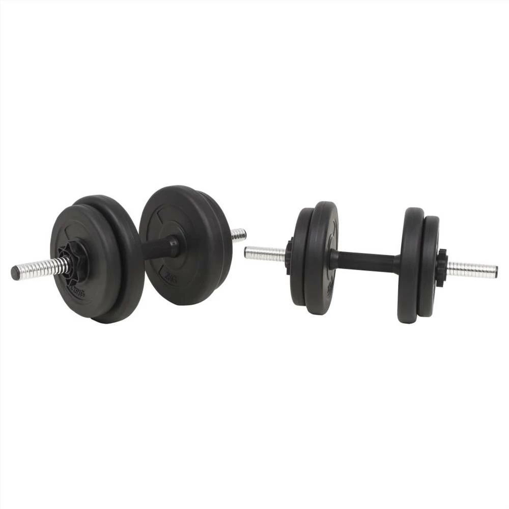 This versatile barbell and dumbbell set is perfect for targeting chest, biceps, arms, triceps and back muscles. It includes two 5 kg weight plates, four 2 kg weight plates, four 1.25 kg weight plates, one barbell bar and two dumbbell bar and has a total weight of about 30 kg. This versatile barbell and dumbbell set is perfect for chest, biceps, arms, triceps and back muscles. It includes two 5 kg plates, four 2 kg plates, four 1.25 kg plates, one barbell bar and two dumbbell bar and has a total weight of about 30 kg. This set allows the users to variably select the weights they want to lift for different exercises. These plates are made of cement with a plastic shell and they can easily be secured onto the bars with the included star locks. The weight is clearly stamped on each plate for quick and easy identification.