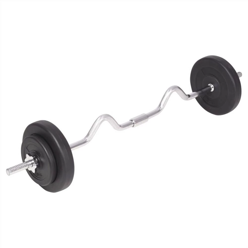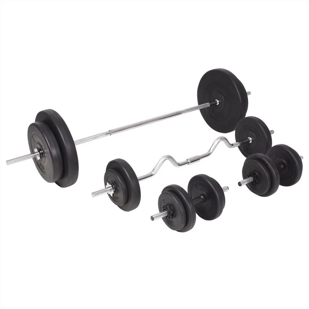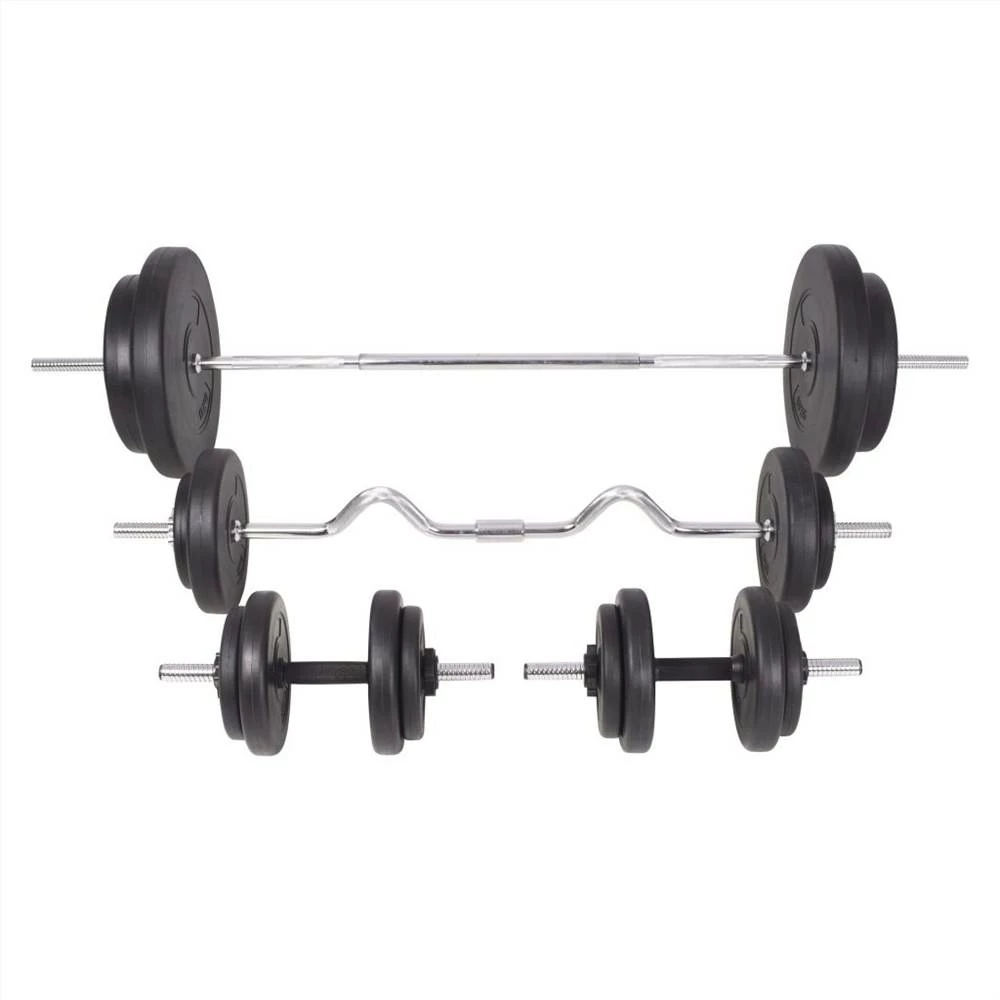 This versatile barbell and dumbbell set is perfect for chest, biceps, arms, triceps and back muscles. It includes two 15 kg plates, two 10 kg plates, two 5 kg plates, four 2.5 kg plates, six 1.25 kg plates, two barbell bar and two dumbbell bar and has a total weight of about 90 kg. This set allows the users to variably select the weights they want to lift for different exercises. These plates are made of cement with a plastic shell and they can easily be secured onto the bars with the included star locks. The weight is clearly stamped on each plate for quick and easy identification.