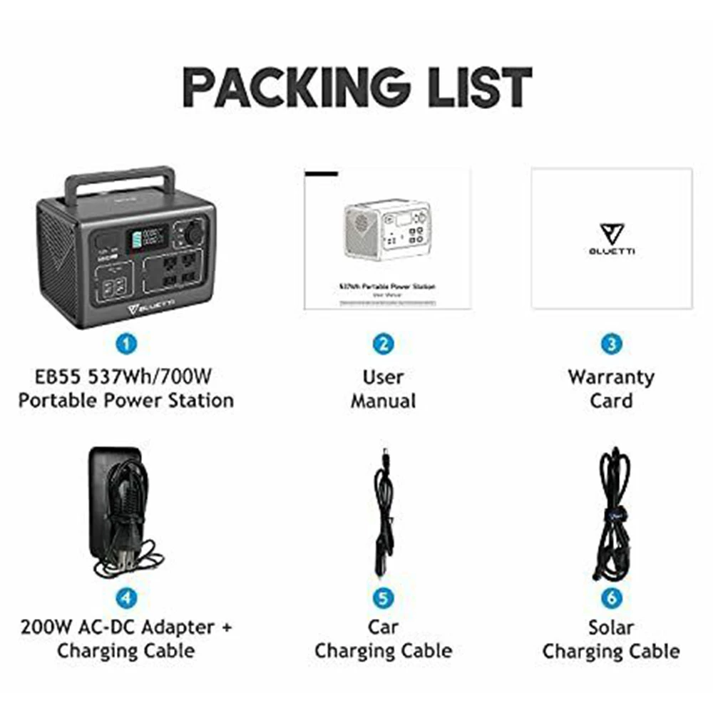 [4 x 110V/700W AC OUTLETS] With the built-in 700W (Surge 1400W) strong inverter and 4 * 110V Pure Sine Wave AC outlets, EB55 is capable of powering most essential appliances for both indoor and outdoor, such as laptop, drone, projector, TV, coffee maker, and more. [537Wh PREMIUM LiFePO4 BATTERY] The ultra-stable LiFePO4 battery chemistry combines with the built-in Battery Management System (BMS) create multi layers of protection, while offering BLUETTI EB55 solar generator 2500+ charge cycles before reaching its 80% capacity. [400W INPUT, FAST RECHARGING] With 200W AC input + 200W PV solar input, this EB55 accepts up to 400W of input power, making it take less than 2 hours to get fully recharged. You can also get the 400W of max power by using dual AC adapters (the 2nd adapter needs bought seperately). [POWER 13 DEVICES SIMUTANEOUSLY] 1 * 100W USB-C port is designed for super-fast charging, 1 * Regulated 12V/10A DC car port combined with 2 * 12V/10A DC outputs provide robust power for DC appliances such as mini-fridge, car vacuum cleaner. 4 * 5V/3A USB-A ports and 1 * 15W wireless charging pad are also equipped. [ALL IN THE PACKAGE] 1 * BLUETTI EB55 700W/537Wh Portable Power Station, 1 * 200W AC Adapter & Charging Cable, 1 * Solar Charging Cable (MC4 to XT60-F), 1 * Car Charging Cable (Car to XT60-F), ), 1 * User Manual,537Wh PREMIUM LiFePO4 BATTERY
