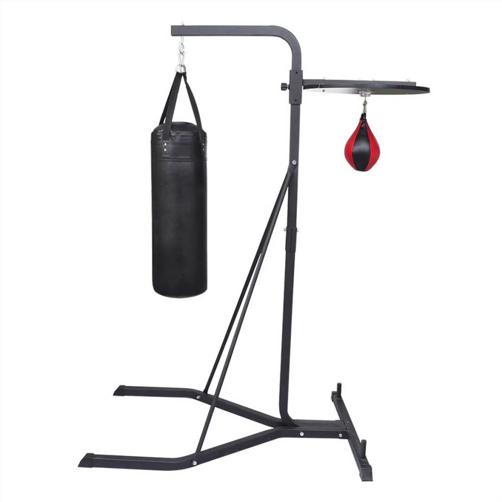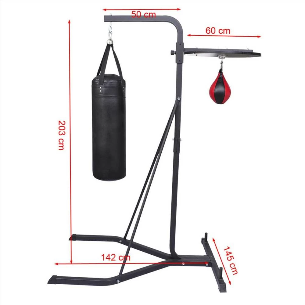 This boxing stand can help improve punching, speed and co-ordination, allowing users to practice and develop punching and kicking techniques. This boxing stand comes complete with the combination of the steel frame, the punching bag, the speedball and its platform. They are suitable for both home and gym use. This stand is made of robust steel, which will guarantee a safe workout. At the end of the feet there are the black bumper end caps which can put weights on to keep the bench more stable, even on an uneven or slippery surface. Hightlights: Punching Bag: 29 x 81 cm (Φ x H), with the weight of 20 kg.Inflatable Speedball: 16 x 28 (Φ x H), with the weight of 0.3 kg.Speedball Platform: Φ 60 cm, with 4 adjustable level from 177.5 cm to 162 cmPainted Steel Frame: with the net weight about 42 kg and the thickness of 1.5 mmDelivery includes 1 x boxing stand frame, 1 x punching bag, 1 x speedball and 1 x speedball platform, including all the mounting accessories.