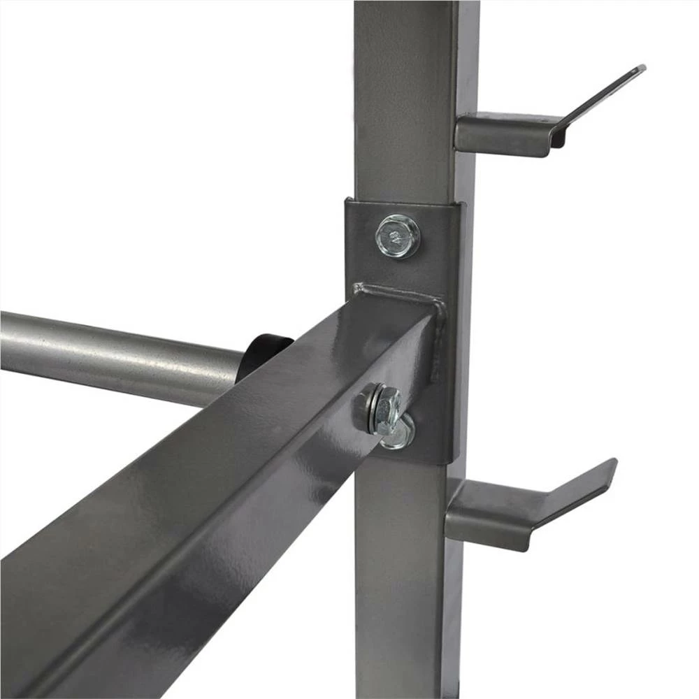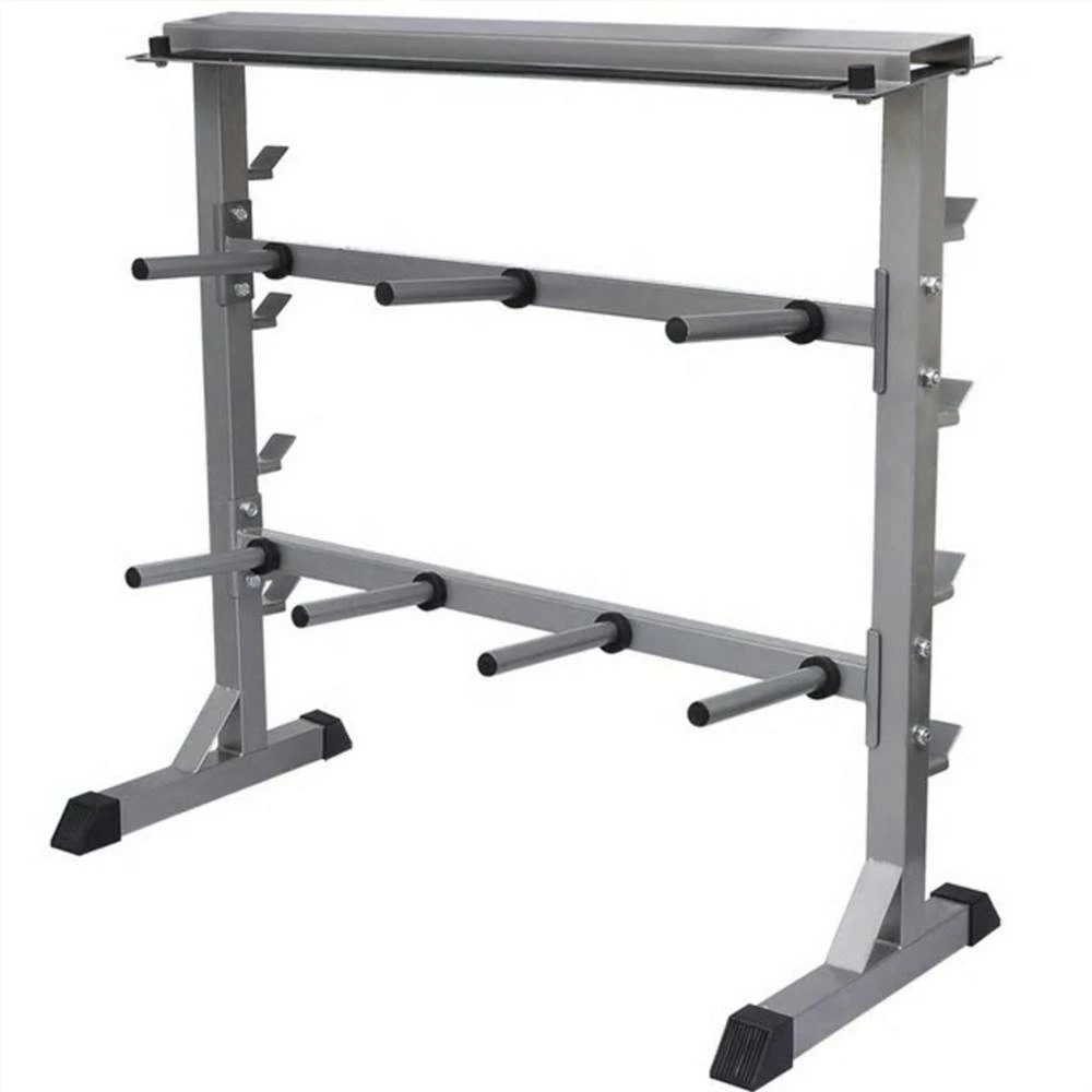 This dumbbell barbell rack is designed to keep free weights, dumbbells and barbells organized and off the floor. It accommodates most dumbbell sizes and styles, including neoprene and cast iron. The stable frame and two shelves will help you maintain a cleaner home gym environment by providing a spot to park your dumbbells when they are not in use. It is made of heavy duty steel for years of use. The rubber non-slip base helps to protect floors from damage and ensures the stability and optimum safety. This rack with its rugged construction has a max load of 300 kg. It’s also suitable for almost all lengths of barbell . It measures 49 by 100 by 95 cm when fully assembled.