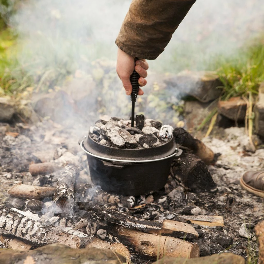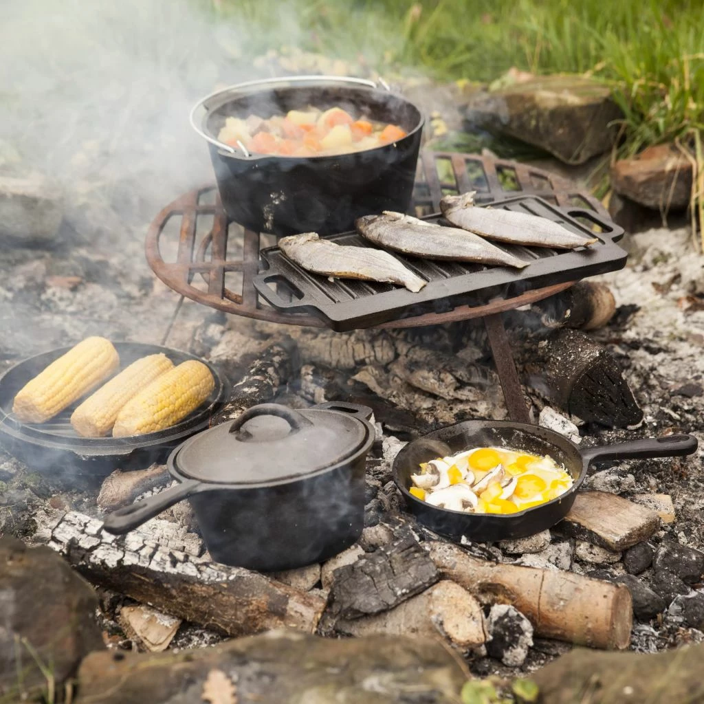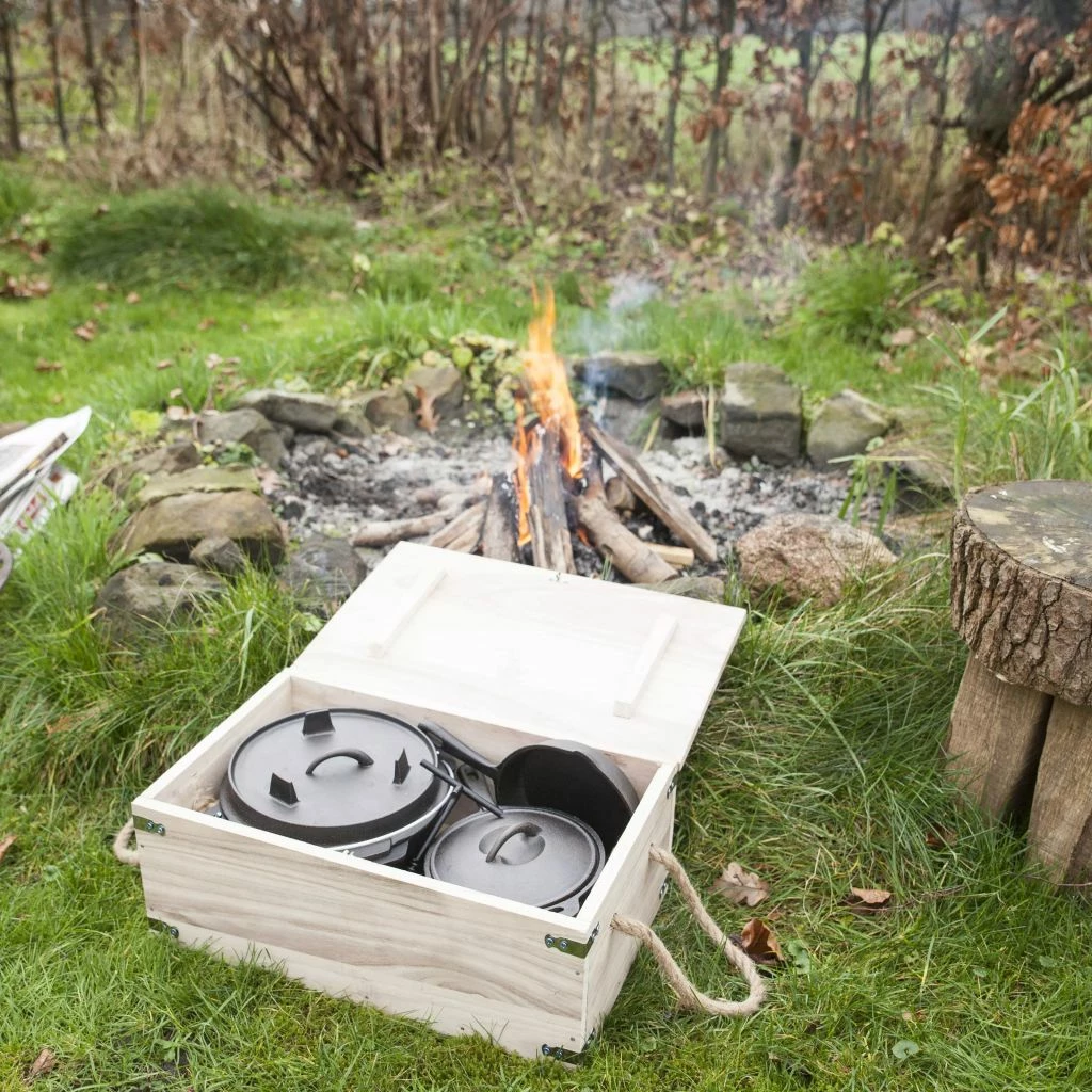 From fresh soups to flavourful stews, you can prepare the most delicious meals over your campfire with this campfire cooking set from Esschert Design. This cooking set is made of solid cast iron, which is durable. The grill plate can be used on two sides. Delivery includes 1 Dutch oven, 1 skillet, 1 saucepan, 1 grill plate and 1 lifter. The set is delivered in a decorative paulownia wooden storage crate with jute rope handles.