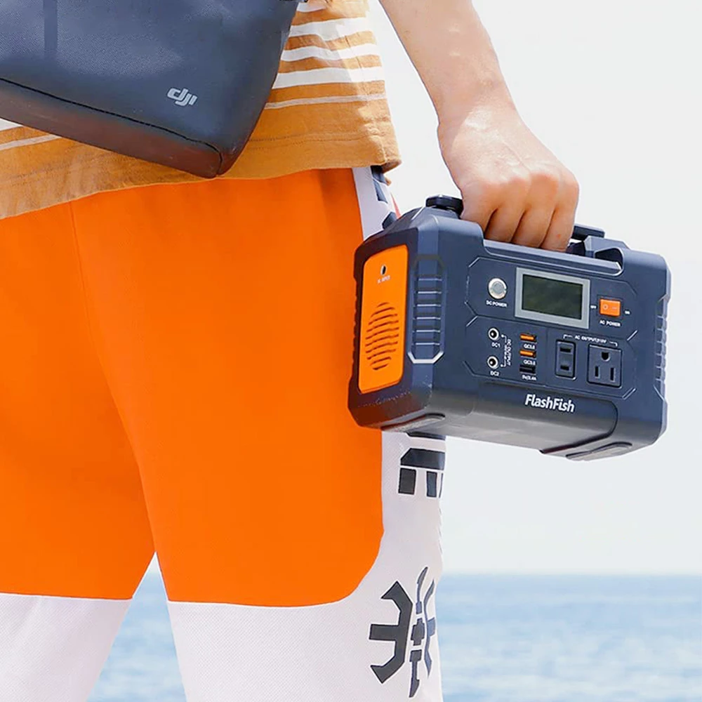 Flashfish power station is equipped with a lithium battery pack, it can be charged by the 15-24Vsolar panel/AC wall outlet/car outlet for more flexibility on the way. Multifunctional ultra-bright LCD screen offers you an intuitive, clear display of remaining battery/ charge/discharge/AC output/DC output status even in dim light.