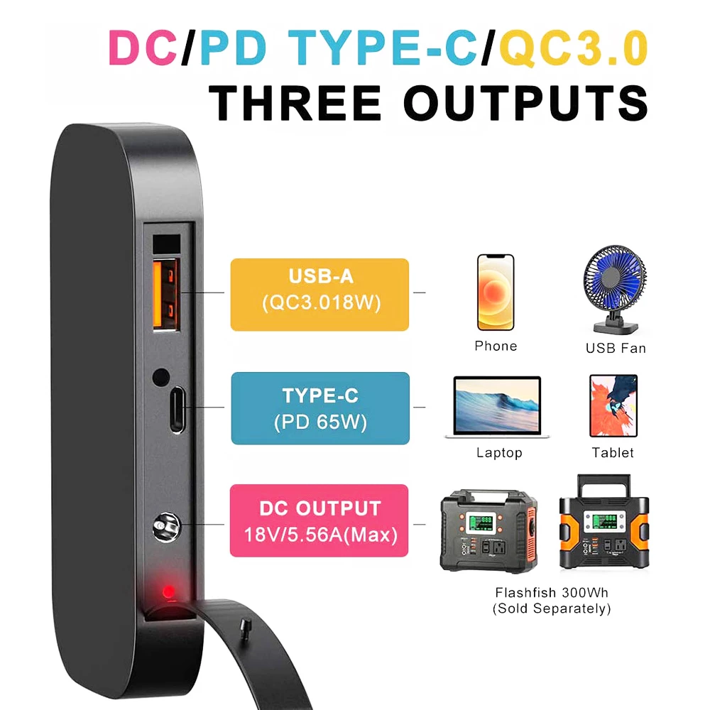 Featured with 1* USB-C(65W) and 1* USB-A(18W) output port, USB-C port support PD charging. Charging multiple small devices at the same time, prepare for your smartphones and tablets(iPhone, iPad, Samsung Galaxy), GPS, digital cameras, etc. Ideally suited for outdoor life and even unexpected power outages.