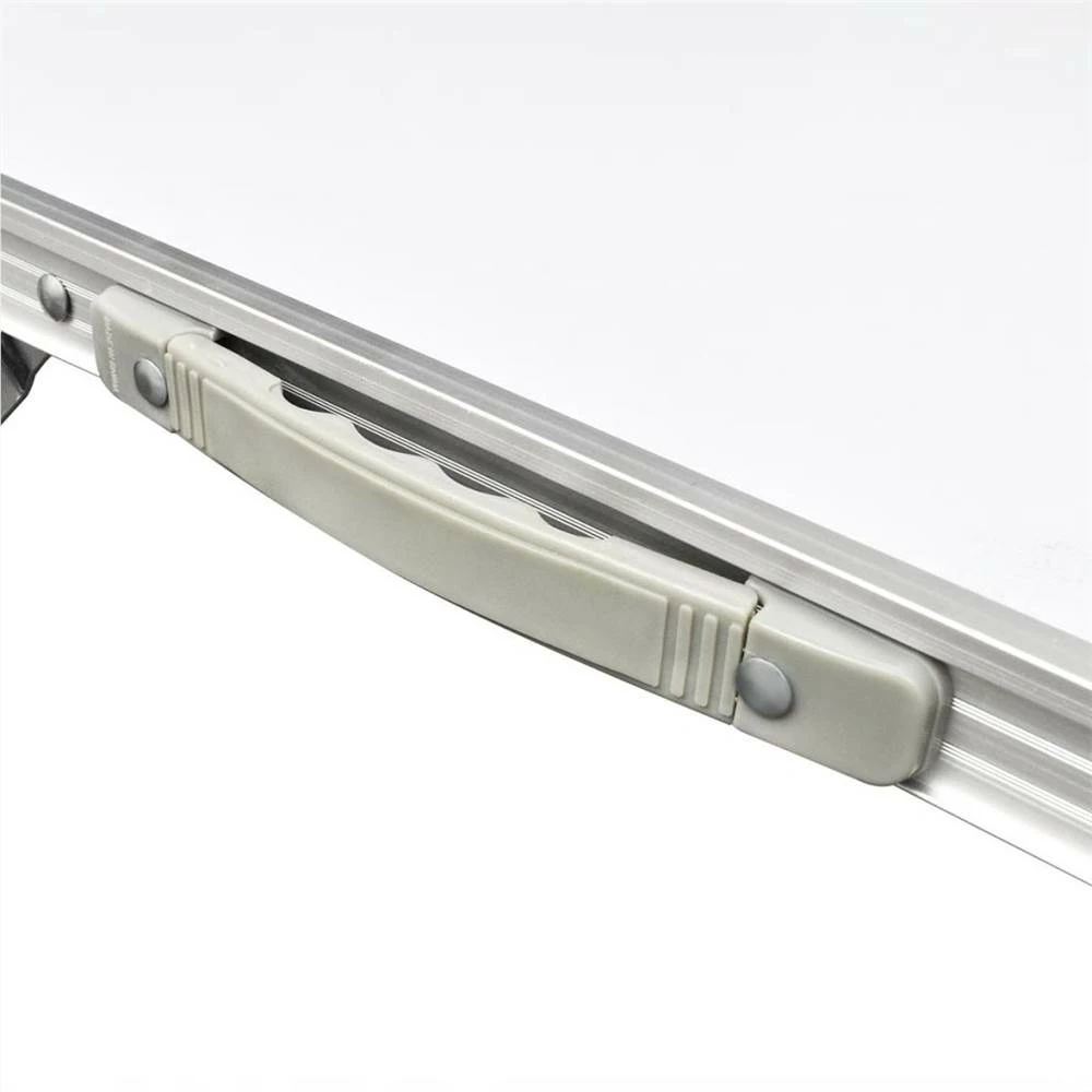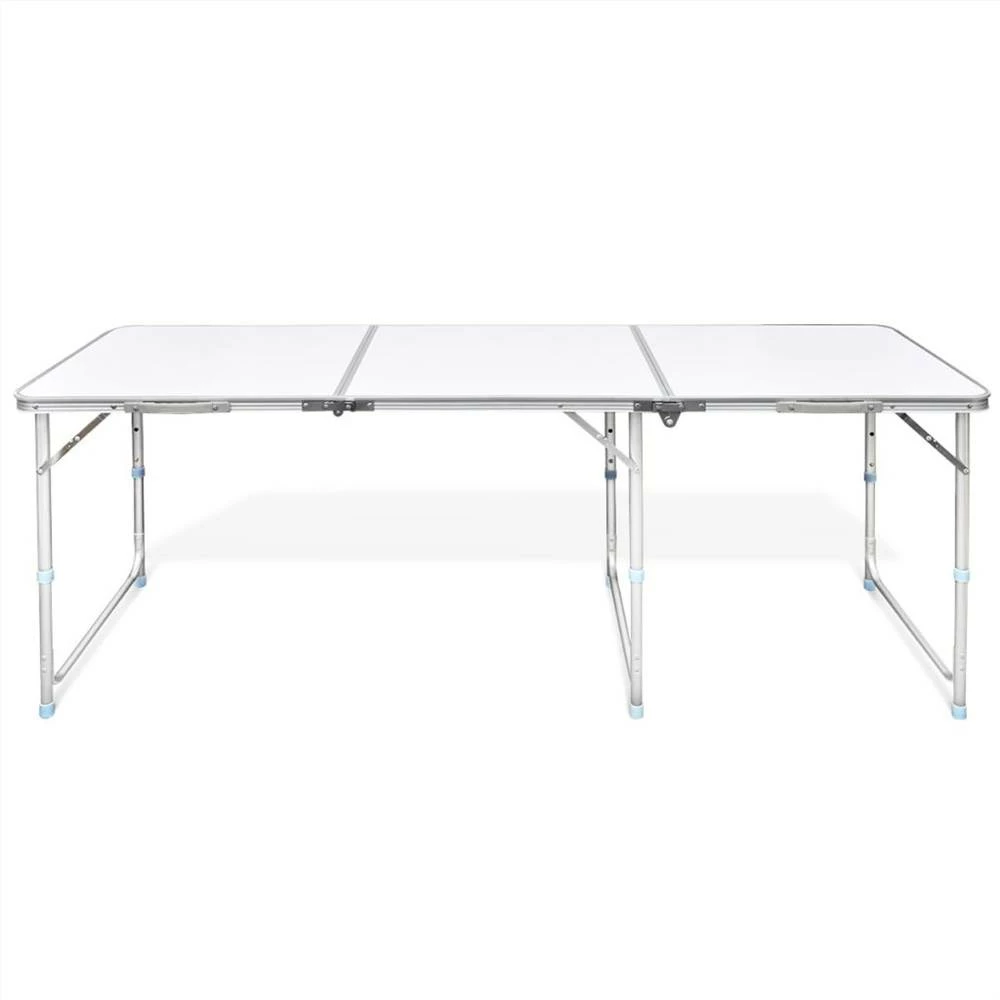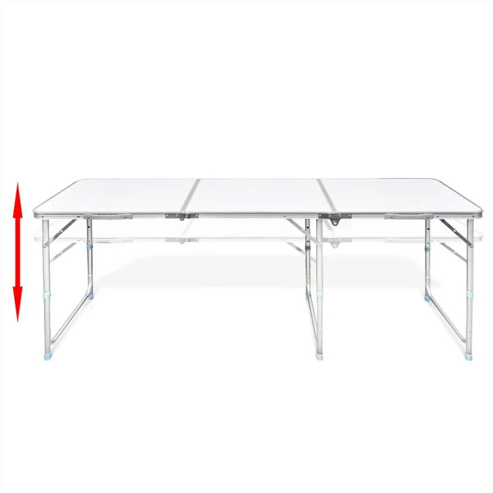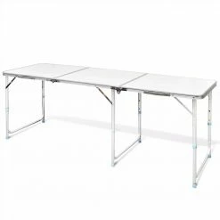 This foldable camping table with practical carrying handle will come in handy in kitchens, on patios, in gardens, and on picnics or camping trips. The table height can be adjusted to 55 cm, 62 cm and 70 cm. The camping table is light in weight. Thanks to the folding design, this camping table is easy to transport and can be stored away quickly when not in use. The carrying handle makes it very easy to bring the table with you when going out to have a picnic or camping trip. Thanks to the sturdy structure, this camping table has a high load capacity of up to 30 – 50 kg. Thanks to the metal frame and the robust MDF tabletop, it is highly stable and durable.
