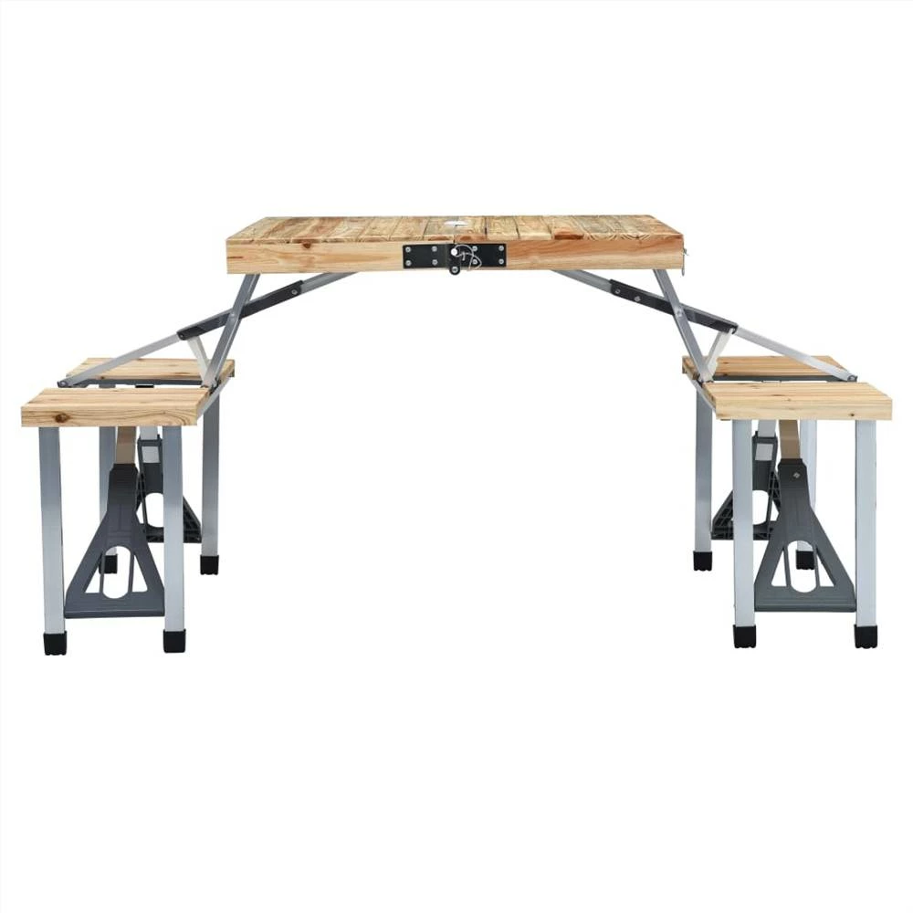 With distinctive portable design, this camping table with seats can be set up and folded in seconds! It will come in handy in gardens, backyards, on patios, and during your picnics or camping trips. The fir wood surface adds to its natural charm; while premium steel and aluminium frame ensures its durability and sturdiness. Thanks to the folding design, this camping table and seats can be folded into a case, which makes it easy to transport and can be stored away quickly when not in use. Additionally, the parasol hole on the tabletop enables you to install a parasol conveniently. Enjoy your outdoor life with this camp furniture!