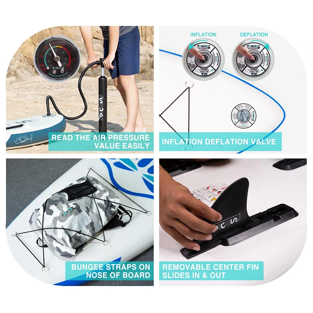Inflated 11′ long 33″ wide 6″ thick, weight 17.6 lbs, maximum capacity is up to 330 lbs, stable and for all skill levels and conditions.