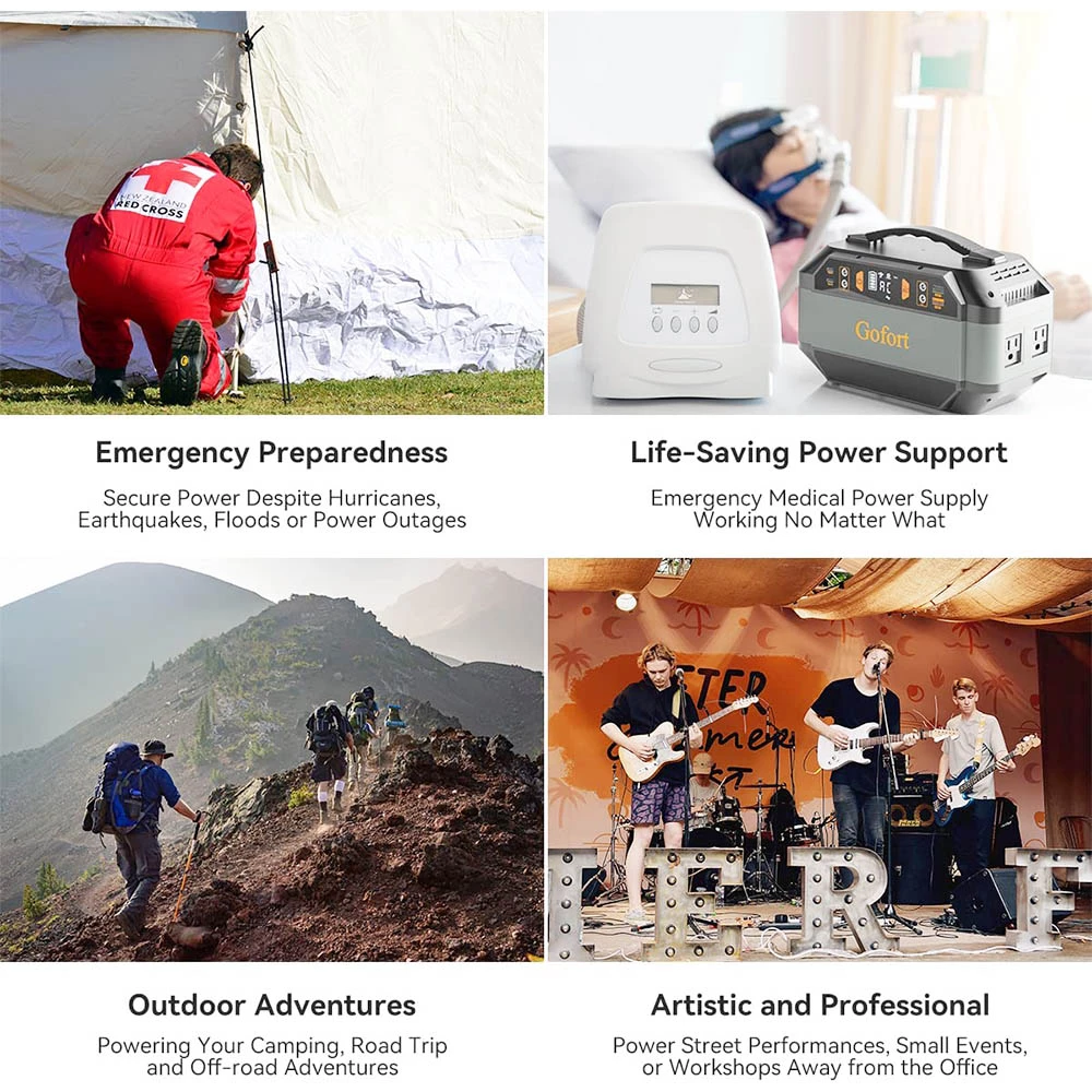Gofort power station is equipped with 2 x AC outlets (330W 600W Peak), 4 x DC ports (12V/10A max), 2 x USB-C port, 1 x QC3.0 USB port, and 1 x USB port (5V/2A). Power your smartphone, laptop, camera, drones, in-car appliances, CPAP machine, refrigerator, blender, and more at anytime. Please kindly note that the battery pack won’t work for devices exceeding 330-watt.