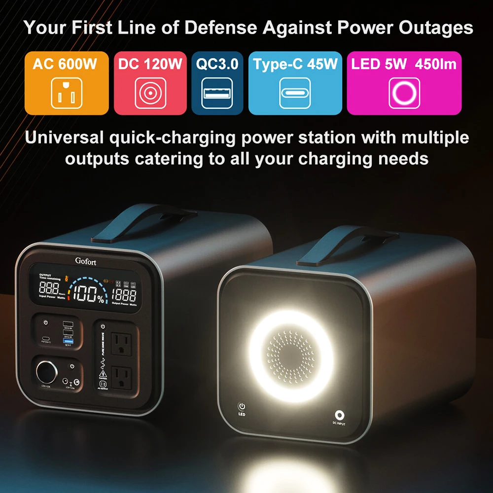 Gofort UA550 is equipped with 2x 600W Pure Sine Wave AC outlets which boast a 600W rated power and a 1000W surge to power for phones, laptops, cameras, lights, etc during hurricane or other power outage for outdoors, camping, RV, etc.