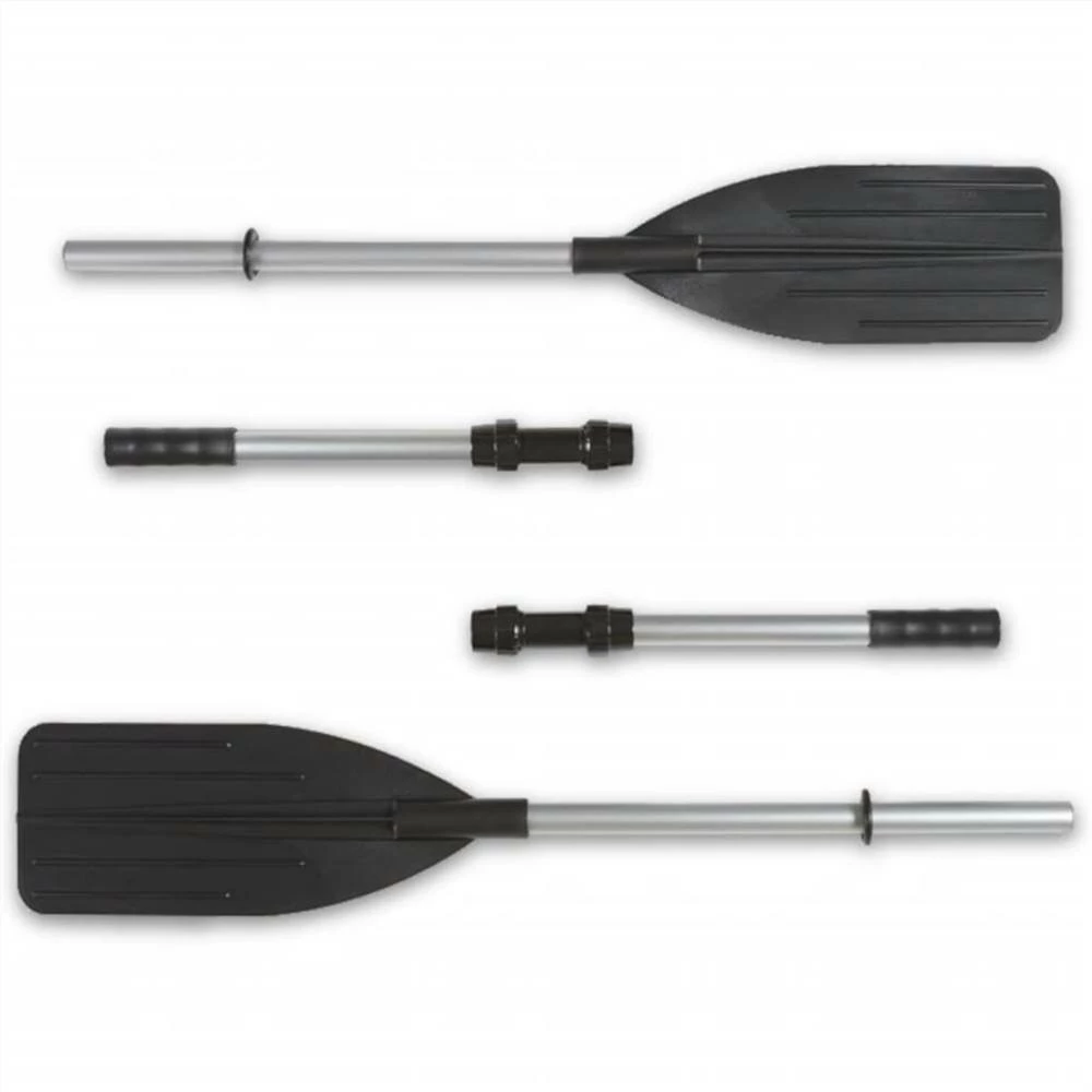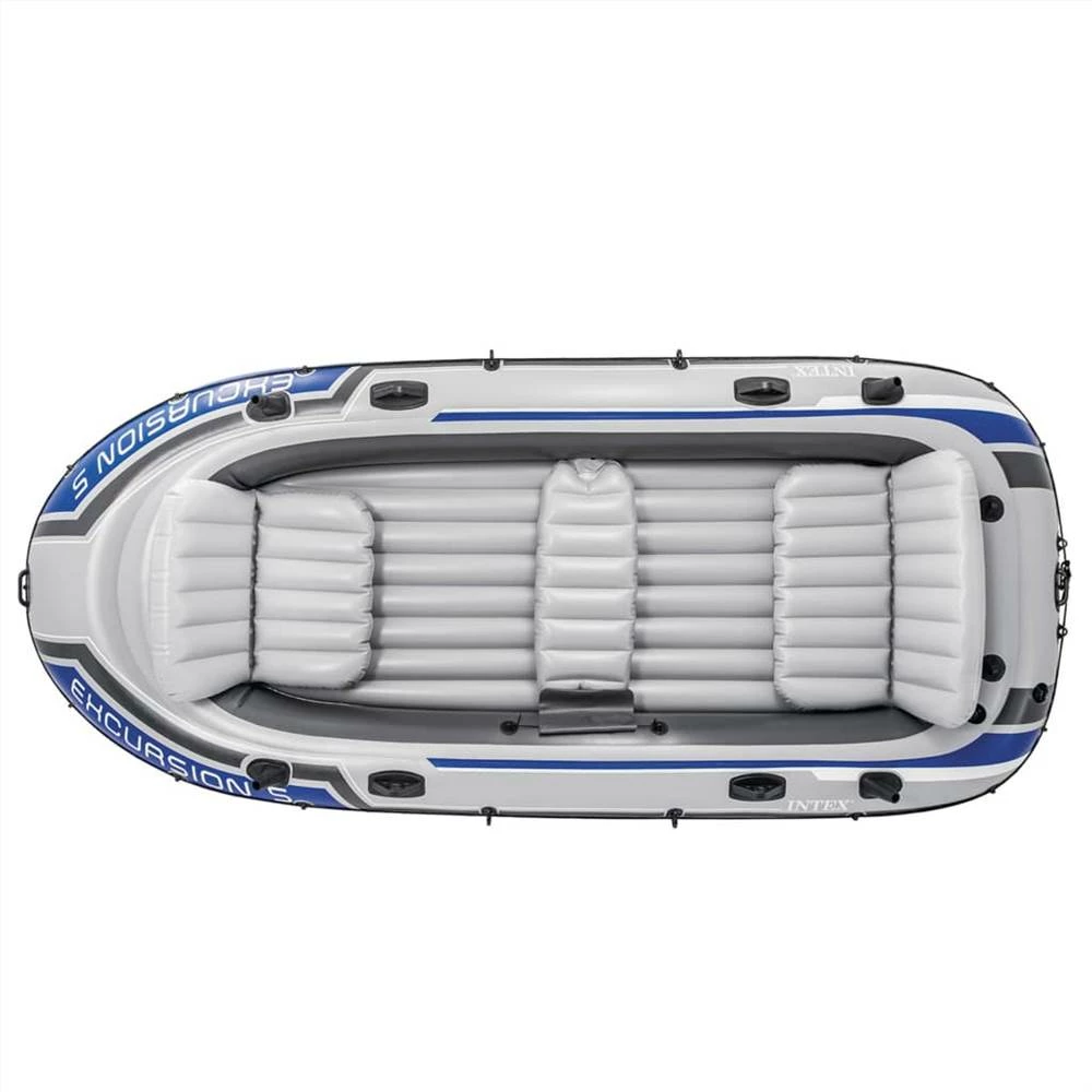The Intex 5-person inflatable boat 68325NP is lightweight and compact, easy to assemble, and ready to take to the water in no time. Enjoy boating wherever you go this summer! Made of high-quality materials, the boat is sturdy and durable, as well as resistant to salt water and sunlight. The inflatable floor forms a completely even surface, which adds to its stability on the water. The included aluminium oars are ergonomically designed and can be taken apart for convenient storage and transport. The boat is equipped with Boston valves on the main hull chambers for quick inflation and deflation. The boat has three roomy inflatable seats, two of them with backrests, and it will accommodate five adults with a maximum combined weight of 455 kg. Delivery includes 1 inflatable boat, 1 high-output hand pump and 2 aluminium oars.