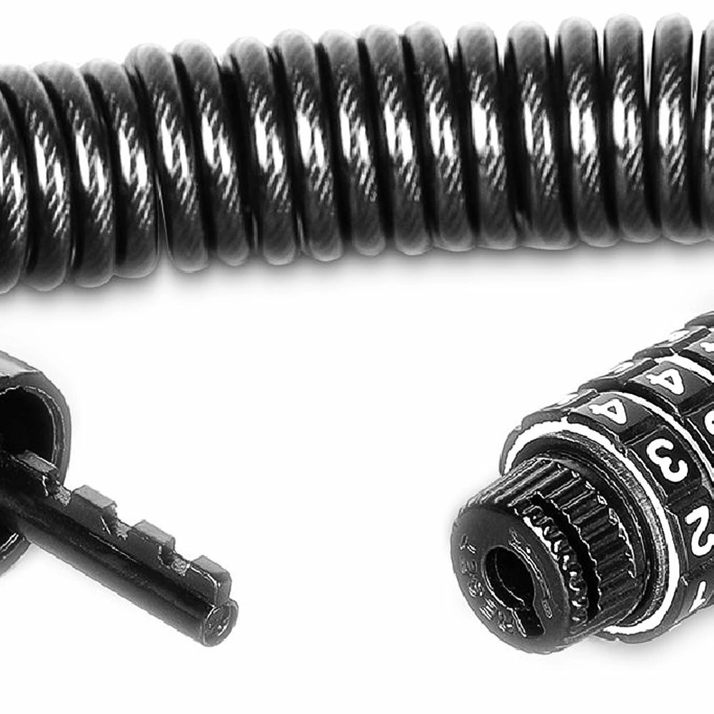The lock is constructed with a metal inner body for durability and plastic-covered cable for resistance.