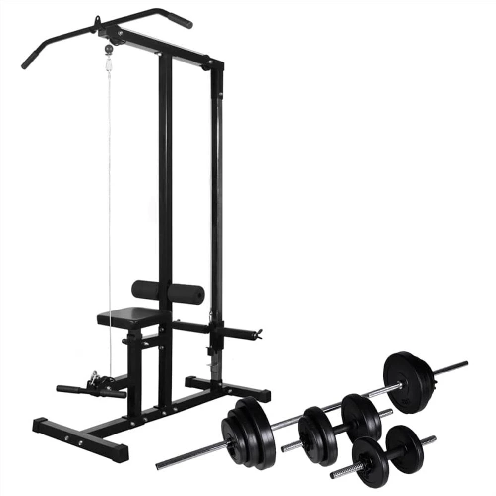 This all-round power tower is ideal for muscle strengthening and toning. It has an adjustable leg lock with 3 settings. The special safety brackets provide extra security during exercise. The barbell and dumbbell set features solid chrome-plated bars with quick-action spring collars (for barbell bar), non-slip knurled grips, and fluted star-screw caps (for dumbbell bars) for secure attachment of the weight plates. You can work out without worrying about safety issues. The weight plates are made with a robust polyethylene casing. They can be combined in various ways for different training purposes. Delivery includes a power tower, a barbell bar, two dumbbell bars, six 1.25 kg weight plates, four 2.5 kg weight plates, two 5 kg weight plates, four caps and two spring collars.
