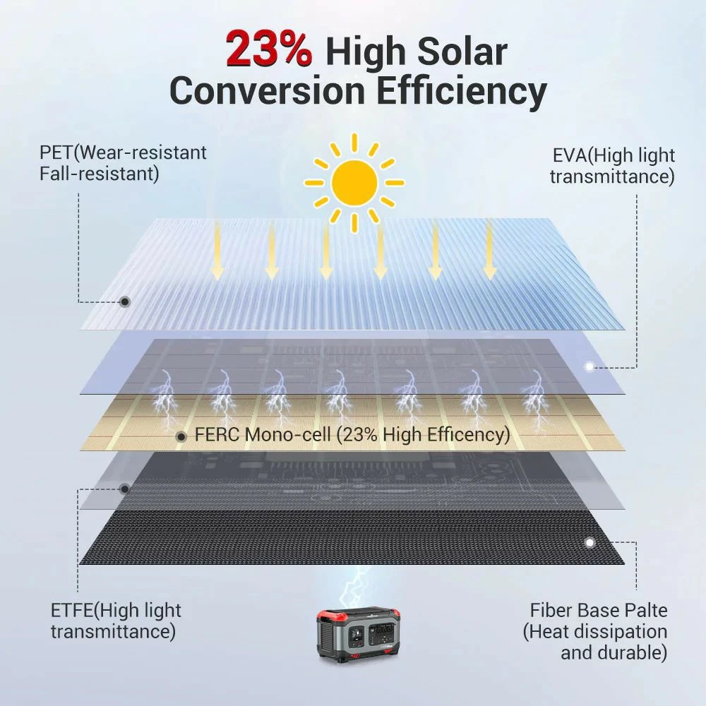 ROCKPALS 200W features a foldable design with a handle. It is IP65 waterproof to endure all weather conditions, ideal for outdoor activities such as camping, climbing, hiking, and picnicking.