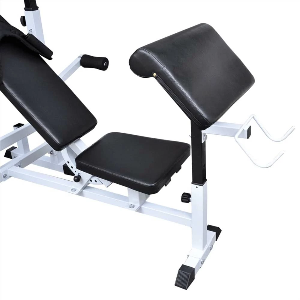 This weight bench with a weight rack and barbell and dumbbell set provides an ideal training solution for beginners and advanced users alike, for individual muscle workouts or combination exercises for entire muscle groups. The bench press can tone arm and chest muscles. The curl and butterfly station provide definition for the shoulders and arms, while the leg-curl works the lower and upper thighs, and a cable pulley strengthens the entire group of back muscles. The wide range of workout combinations and exercises allows for an effective, total body workout, while the adjustable settings enable the workout to be adapted to suit your specific needs. The sturdy steel construction of the bench ensures your safety during the exercises. The rubberised, non-slip feet add more stability. This versatile barbell and dumbbell set is perfect for chest, biceps, arms, triceps and back muscles. It includes two 15 kg plates, two 10 kg plates, two 7.5 kg plates, four 5 kg plates, six 2.5 kg plates, six 1.25 kg plates, two barbell bars and two dumbbell bars and has a total weight of about 120 kg. This set allows the users to variably select the weights they want to lift for different exercises. These plates are made of cement with a plastic shell and they can easily be secured onto the bars with the included star locks. The weight is clearly stamped on each plate for quick and easy identification.