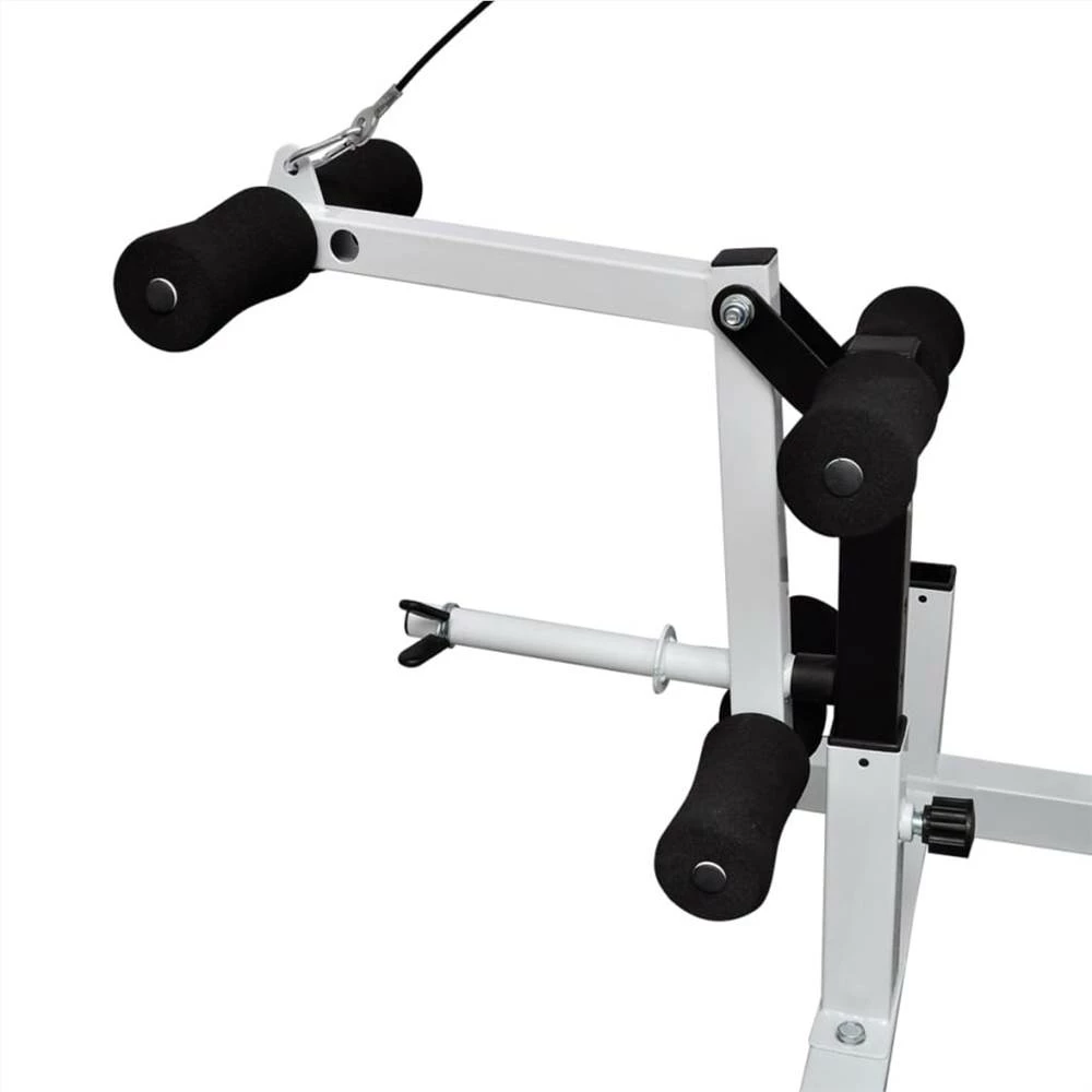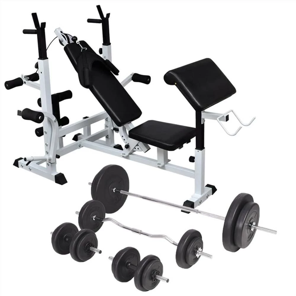 This weight bench with a weight rack and barbell and dumbbell set provides an ideal training solution for beginners and advanced users alike, for individual muscle workouts or combination exercises for entire muscle groups. The bench press can tone arm and chest muscles. The curl and butterfly station provide definition for the shoulders and arms, while the leg-curl works the lower and upper thighs, and a cable pulley strengthens the entire group of back muscles. The wide range of workout combinations and exercises allows for an effective, total body workout, while the adjustable settings enable the workout to be adapted to suit your specific needs. The sturdy steel construction of the bench ensures your safety during the exercises. The rubberised, non-slip feet add more stability. The versatile barbell and dumbbell set is perfect for chest, biceps, arms, triceps and back muscles. It includes two 15 kg plates, two 10 kg plates, two 5 kg plates, four 2.5 kg plates, six 1.25 kg plates, two barbell bars and two dumbbell bars and has a total weight of about 90 kg. This set allows the users to variably select the weights they want to lift for different exercises. These plates are made of cement with a plastic shell and they can easily be secured onto the bars with the included star locks. The weight is clearly stamped on each plate for quick and easy identification.