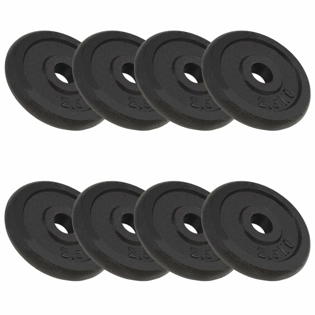 This set consists of 8 weight plates that weigh 2.5 kg each. It will be perfect for strengthening and shaping your muscles when used with a barbell bar, dumbbell bar or curl bar with a diameter of 30 mm. It is ideal for use at home or in a gym. These weight plates are made of high-quality cast iron with a lacquer finish. The weight is clearly stamped on each plate for quick and easy identification.