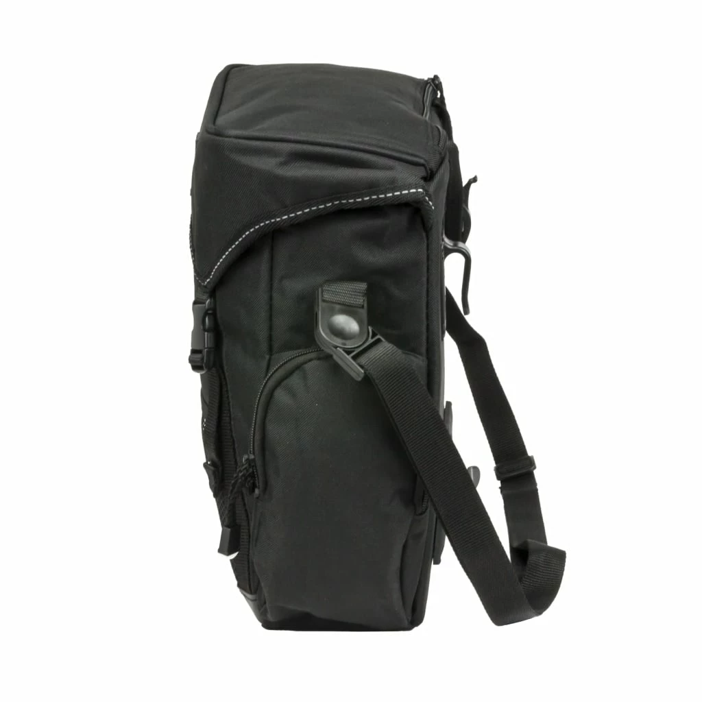 This Willex pannier is a great accessory for bicycles. The bag is made of water-resistant polyester and is therefore extremely durable and highly practical. It has reflective stitching for visibility. With a capacity of 10 litres, the single pannier is ideal for general daily use. It has been designed with a mesh front pouch and two zipped pouches on sides. The bag has an adjustable and removable shoulder strap. It is also equipped with the hook and loop fasteners and hooks, so this pannier is very easy to mount.