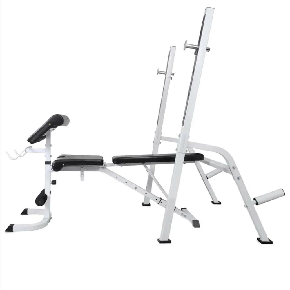 This adjustable workout bench with a weight rack and barbell and dumbbell set will be a great choice for working out in the comfort of your own home, and saves you the hassle and expense of going to a gym. This workout bench provides a wide range of exercise options. The backrest will strengthen your back muscles. Thanks to the arm curl cushion, arms can be exercised. The wide range of workout combinations and exercises allows for an effective, total body workout, while the adjustable levels enable the workout to be adapted to suit your specific needs. The sturdy steel construction of the bench ensures your safety during the exercises. The durable cotton-padded cushion will offer you the utmost comfort. This versatile barbell and dumbbell set is perfect for chest, biceps, arms, triceps and back muscles. It includes two 15 kg plates, two 10 kg plates, two 7.5 kg plates, four 5 kg plates, six 2.5 kg plates, six 1.25 kg plates, two barbell bars and two dumbbell bars and has a total weight of about 120 kg. This set allows the users to variably select the weights they want to lift for different exercises. These plates are made of cement with a plastic shell and they can easily be secured onto the bars with the included star locks. The weight is clearly stamped on each plate for quick and easy identification.