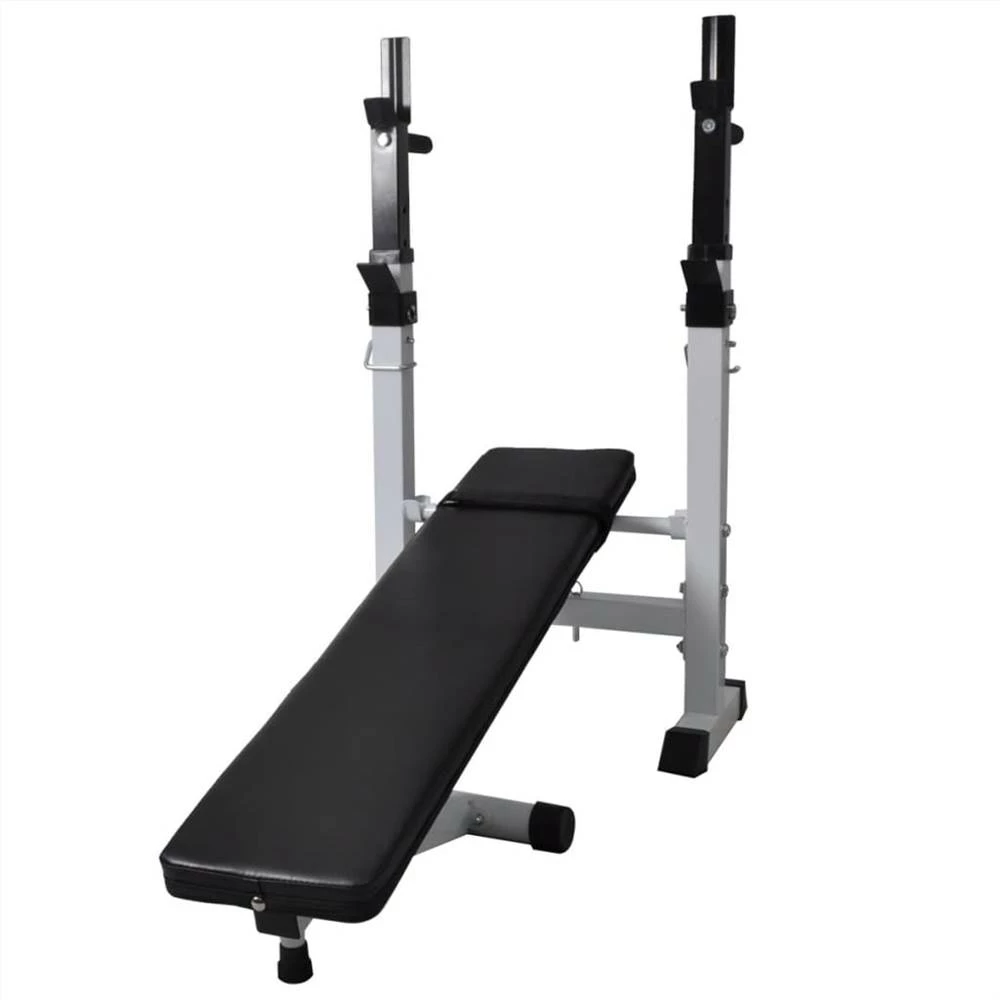 This adjustable workout bench with a weight rack and barbell and dumbbell set will be a great choice for working out in the comfort of your own home, and saves you the hassle and expense of going to a gym. The adjustable, padded bench can be inclined or placed horizontally. You can choose either position to meet your requirements. This bench is suitable for homes and offices with limited space, as it can easily be stored vertically when not in use. The sturdy steel construction of the bench ensures your safety during the exercises. The durable cotton-padded cushion will offer you the utmost comfort. The barbell and dumbbell set features solid chrome-plated bars with quick-action spring collars (for barbell bar), non-slip knurled grips, and fluted star-screw caps (for dumbbell bars) for secure attachment of the weight plates. You can work out without worrying about safety issues. The weight plates are made with a robust polyethylene casing. They can be combined in various ways for different training purposes. Delivery includes a workout bench, a barbell bar, two dumbbell bars, six 1.25 kg weight plates, four 2.5 kg weight plates, four 5 kg weight plates, two 10 kg weight plates, four caps and two spring collars.