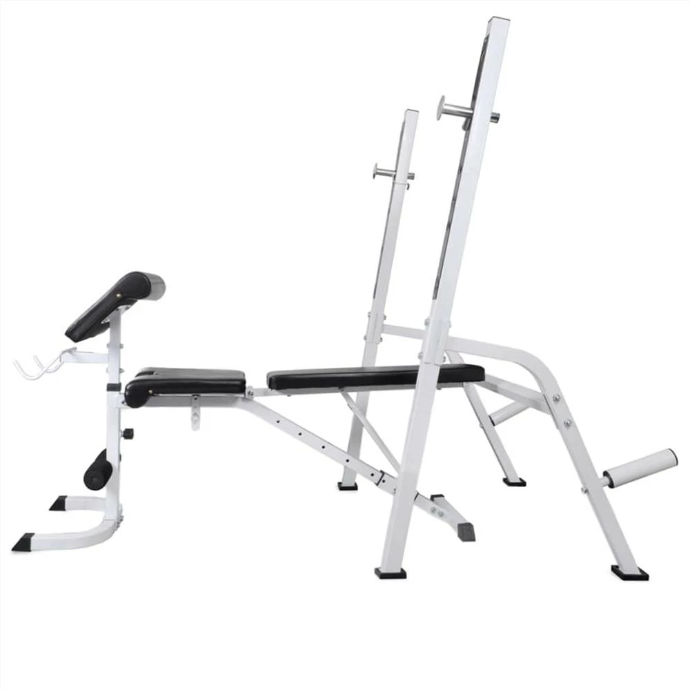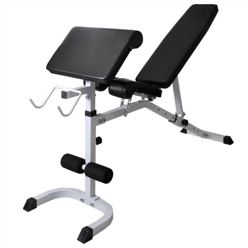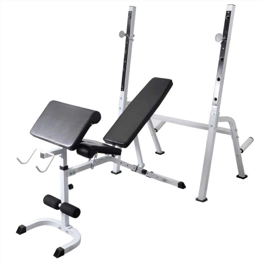 This adjustable workout bench with a weight rack and barbell and dumbbell set will be a great choice for working out in the comfort of your own home, and saves you the hassle and expense of going to a gym. This workout bench provides a wide range of exercise options. The backrest will strengthen your back muscles. Thanks to the arm curl cushion, arms can be exercised. The wide range of workout combinations and exercises allows for an effective, total body workout, while the adjustable levels enable the workout to be adapted to suit your specific needs. The sturdy steel construction of the bench ensures your safety during the exercises. The durable cotton-padded cushion will offer you the utmost comfort. The versatile barbell and dumbbell set is perfect for chest, biceps, arms, triceps and back muscles. It includes two 15 kg plates, two 10 kg plates, two 5 kg plates, four 2.5 kg plates, six 1.25 kg plates, two barbell bars and two dumbbell bars and has a total weight of about 90 kg. This set allows the users to variably select the weights they want to lift for different exercises. These plates are made of cement with a plastic shell and they can easily be secured onto the bars with the included star locks. The weight is clearly stamped on each plate for quick and easy identification.